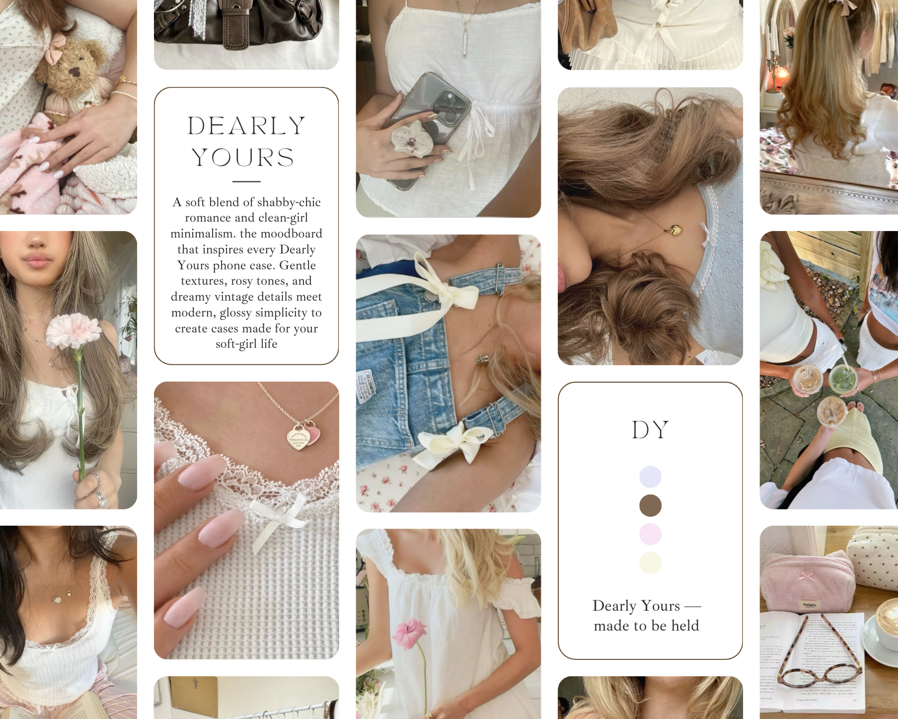 A soft blend of shabby-chic romance and clean-girl minimalism the moodboard that inspires every Dearly Yours phone case. Gentle textures, rosy tones, and dreamy vintage details meet modern, glossy simplicity to create cases made for your soft-girl life.